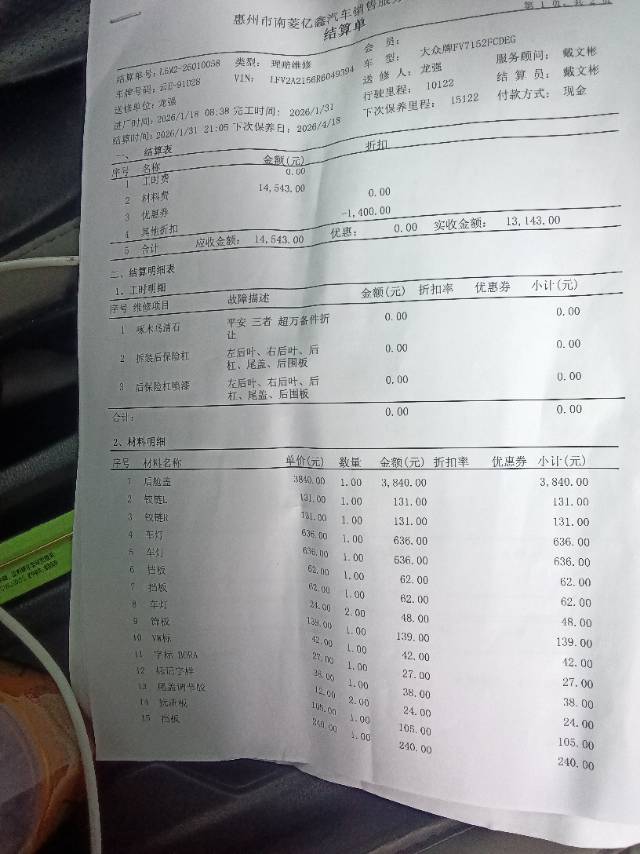 我的车子在2026年1月18号晚上发生了交通事故。拖到他们一汽大众店里面去维修。当时我已经很明确要求换更换原厂配件。结果给我维修了半个月,还返工了三次。 保险公司赔的配件有的没给我更换。而且在维修过程中。前挡风玻璃和后挡风玻璃。施工过程中被电焊烫伤了。 他们店里面不给我处理还他推诿。 和我说不行你就去告我。 至今已经过了快两个月了也不联系我,也不给我处理意见。 打厂家400也不给我处理打厂家400也不给我处理。