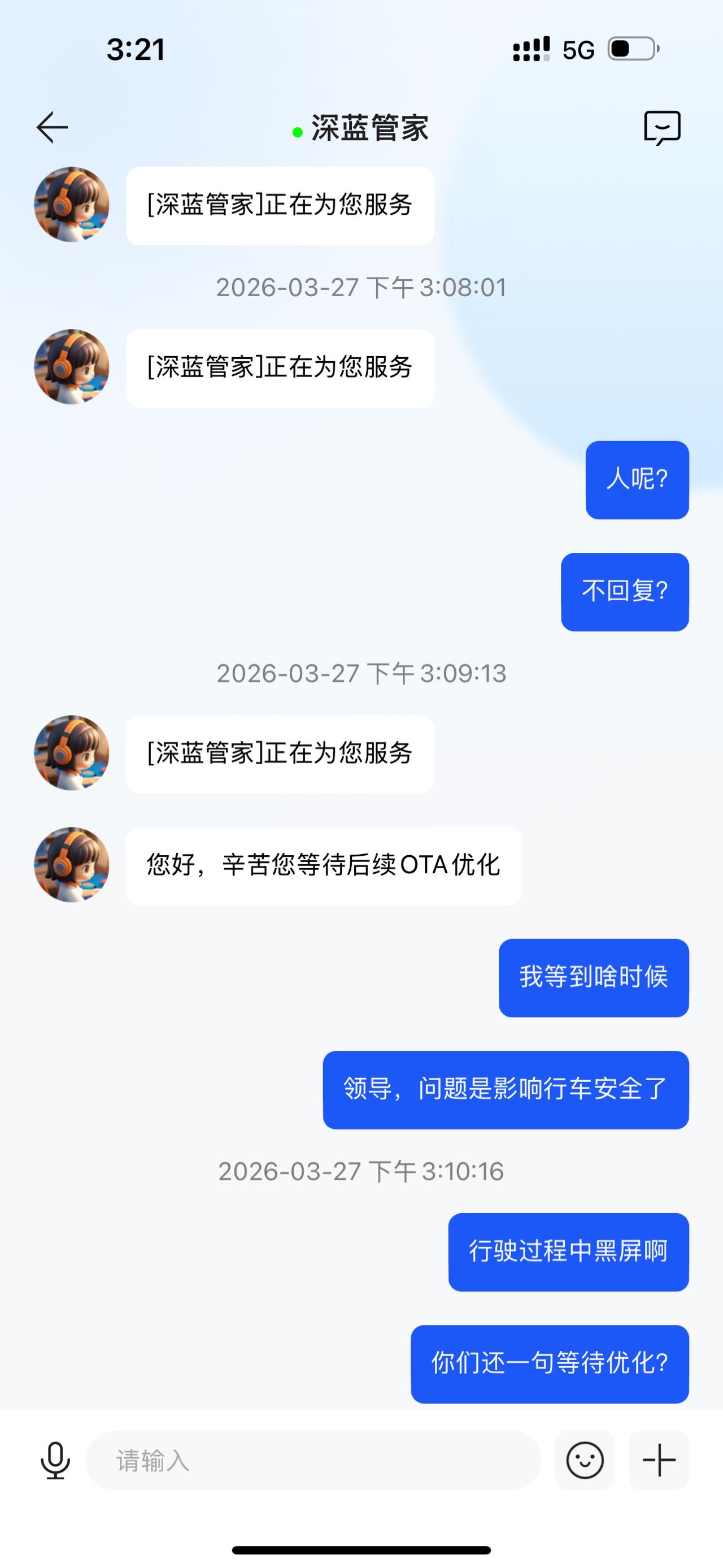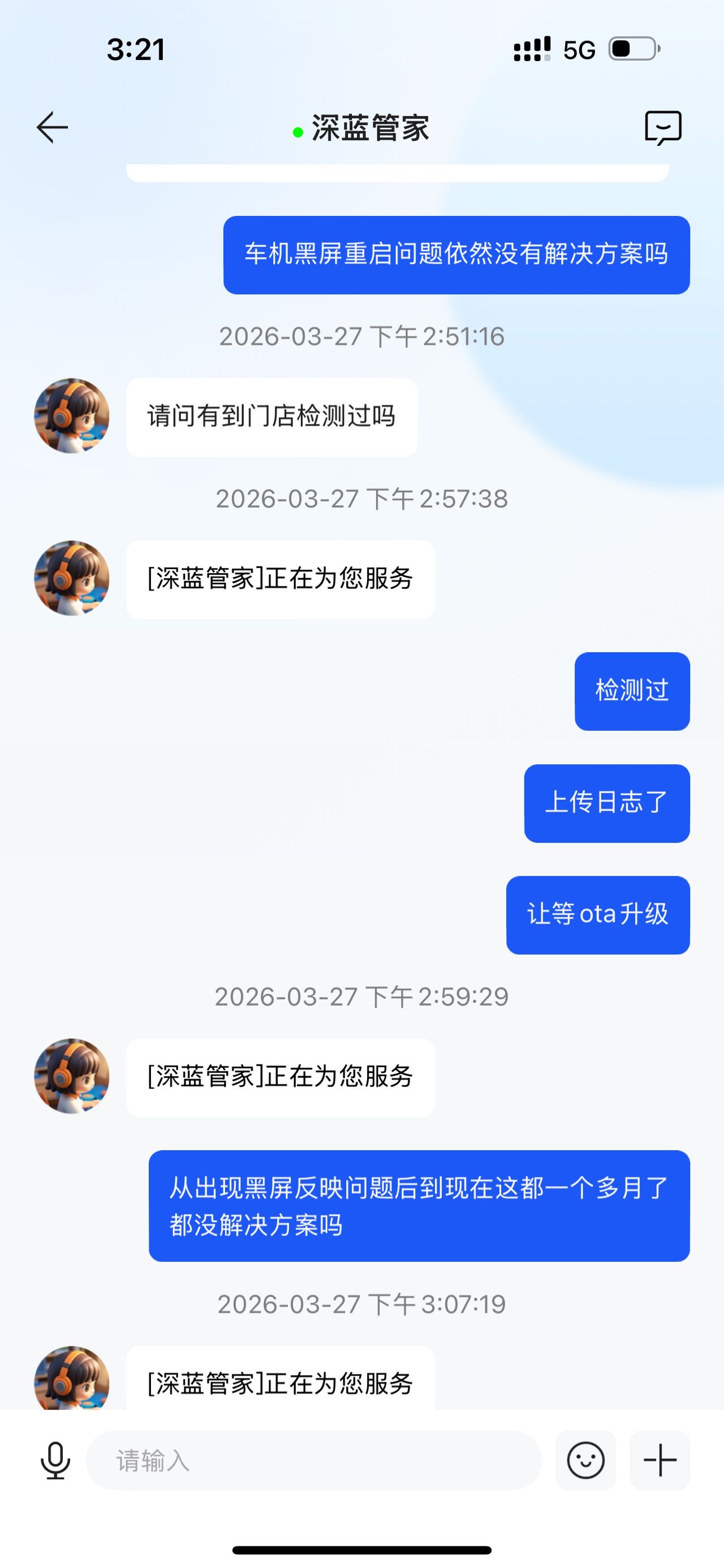 车辆启动或行驶中车机黑屏重启,从出现问题到3.27日期间问题出现频率高,基本每天都会出现车机重启严重影响行驶安全,厂家客服回复等ota升级,一直没有升级通知没有解决问题