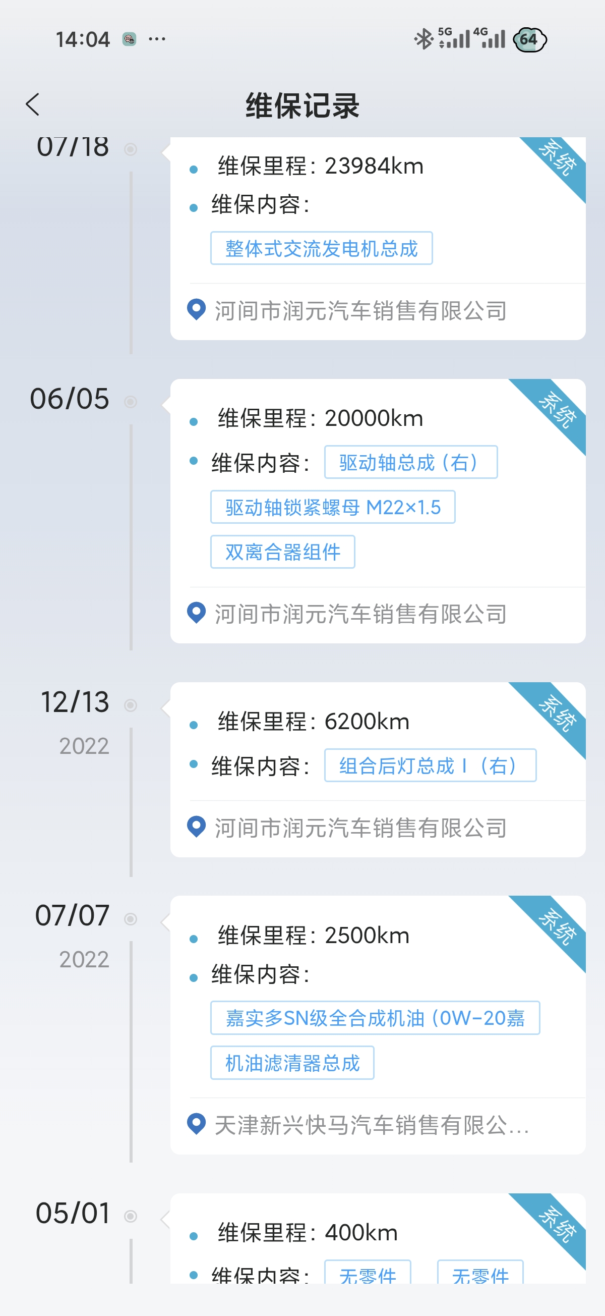 2022年4月买的车5月线束损坏高速120迈瞬间失去动力。2022年5月发现避震有问题,检查没检查出毛病来,2024年6月,车辆切换档位熄火,更换双离合,发现避震问题右侧传动轴磨损严重,7-10月熄火问题解决不了两万多公里的时候,11月解决问题同年7月发动机损坏方向盘抱死刹车抱死26年2月23日发现变速箱漏油有很多没有记录