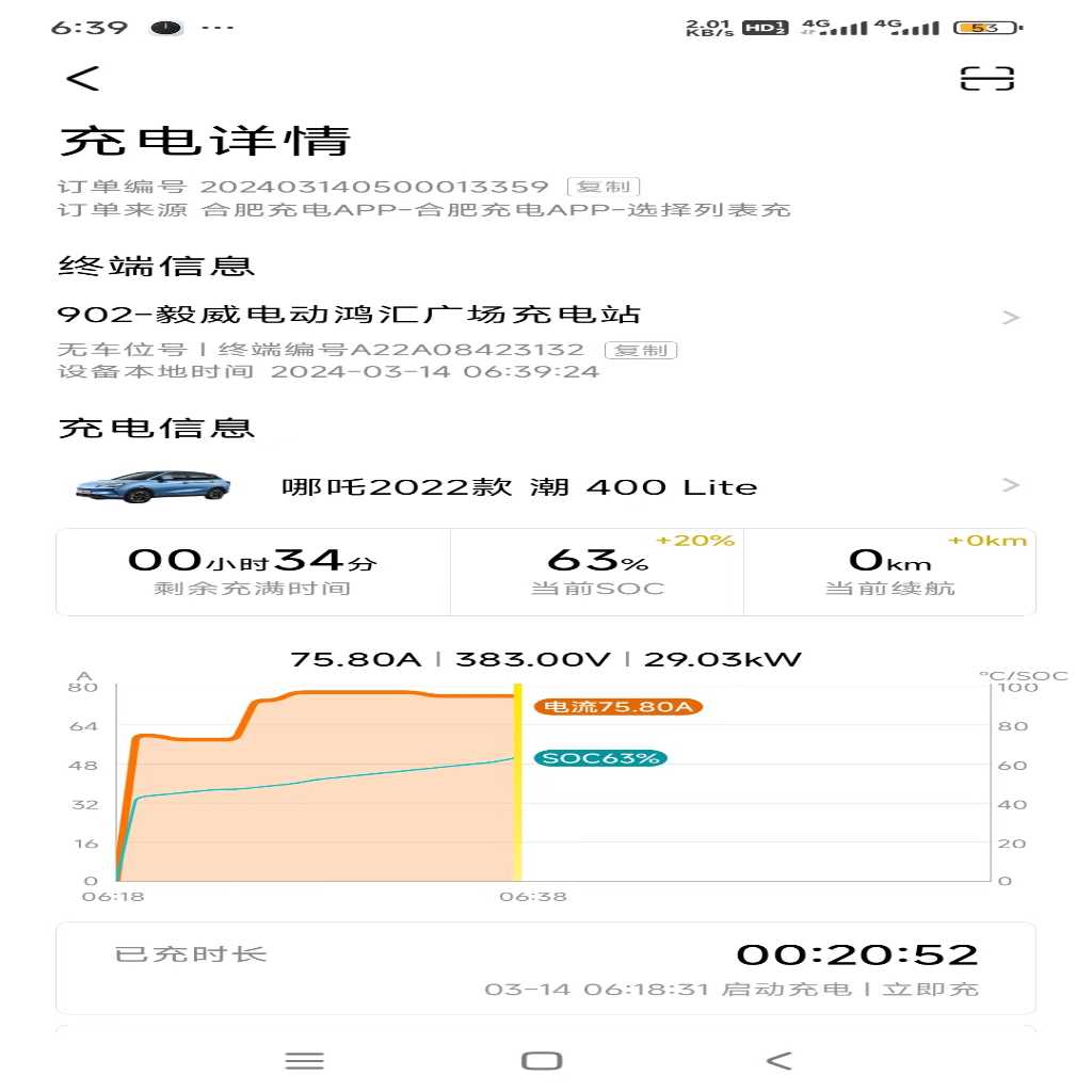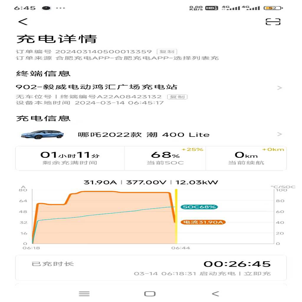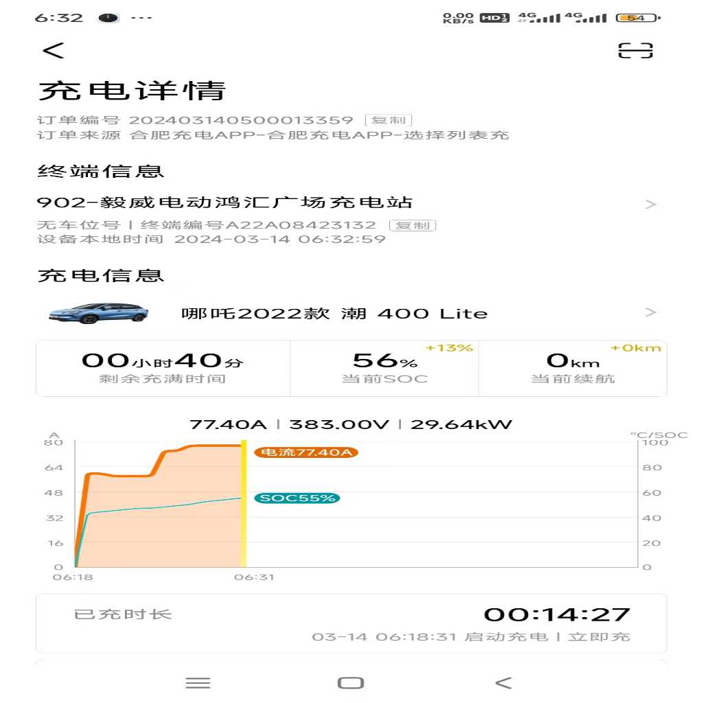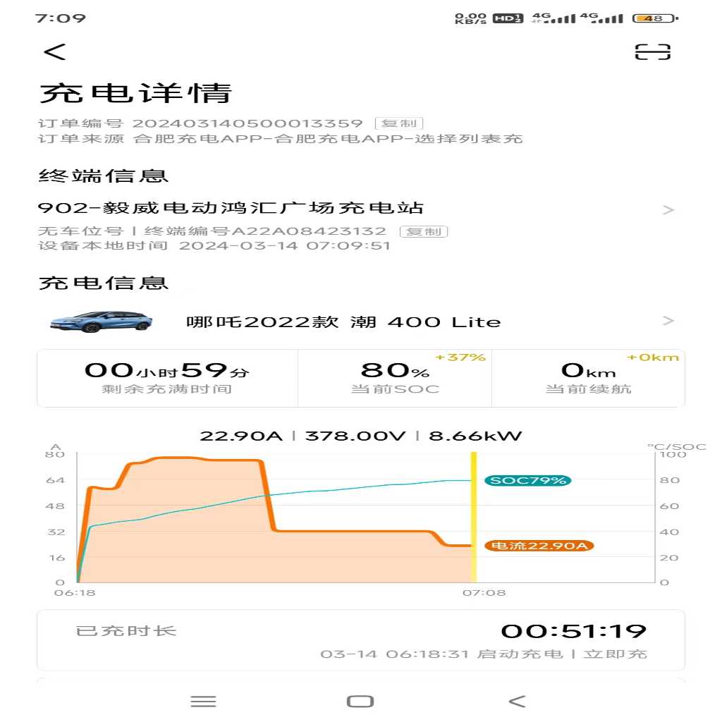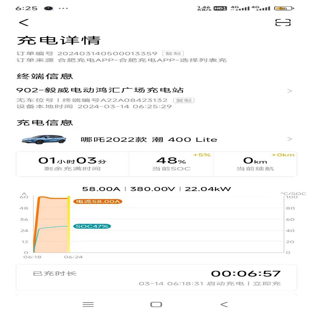 23年8月购买的哪吒V潮400lite,刚买的时候充电挺快的最快充电功率能到50多KW,电流140A左右。后面10月车机推送了个1.92系统更新后充电功率降了10kw最多只能到42kw左右,但是还能用充到80%左右降功率慢充14.5kw;今年3月份后充电功率又降了68%就直接进入慢充,最快也就不到30kw快充桩两小时充不满,送去4s店检测后结果是电池没问题充电确实慢,检测报文发到厂家等反馈,一个星期过去了厂家无任何回复